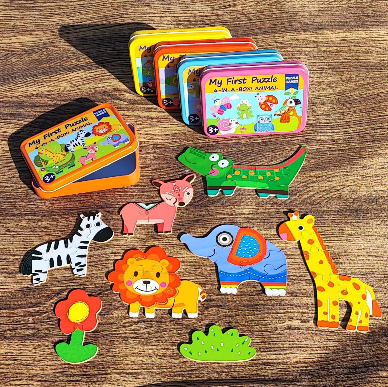 ۶ عدد پازل چوبی در یک قوطی فلزی